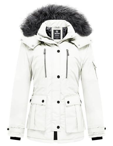 Wantdo Femme Manteau Hiver Chaud Veste Epaisse Manteau à Capuche en Fausse Fourrure Blouson Hiver Chaud Parka Hiver Chaude Multi-Poche Lait Blanc S