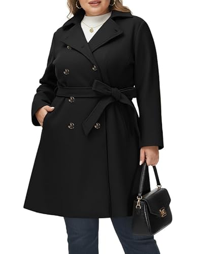 Hanna Nikole Manteau en laine pour femme Grandes tailles Manteau d'hiver à double boutonnage avec poches Ceinture Manches longues Trench de longueur moyenne, Noir , 50 grande taille