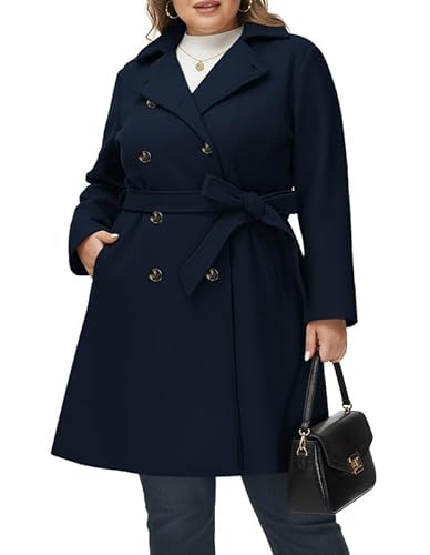 Hanna Nikole Manteau en laine pour femme Grandes tailles Manteau d'hiver à double boutonnage avec poches Ceinture Manches longues Trench de longueur moyenne, Bleu marine, 54 grande taille