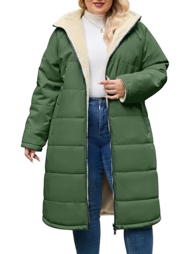 CMTOP Manteau Femme Hiver Long Grande Taille Doublure en Polaire Chaud Manteaux à Capuche, Peluche Épaisse Thermique Veste Blouson Coupe-Vent Parka Oversize Outcoat avec Poches(Vert Militaire,XXL)