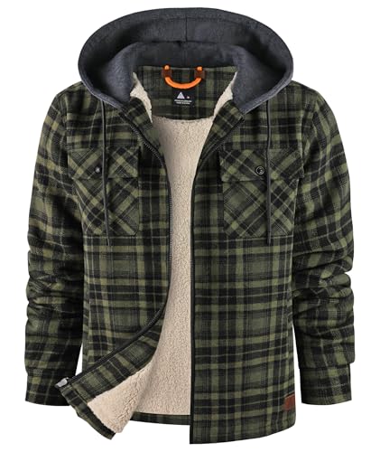 zitysport Chemise pour Homme Sherpa Polaire à Carreaux Doublée Veste à Capuche Doublure Manteau Veste d'hiver avec Poches Flanelle Chemise Hommes Carreaux Sweat Capuche(Vert Militaire L)