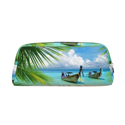 AQRJLPO Trousse à crayons simple en cuir imprimé bateau bord de mer feuilles de noix de coco mignon trousse à crayons, trousse à stylos, papeterie scolaire, trousse de maquillage pour garçons filles