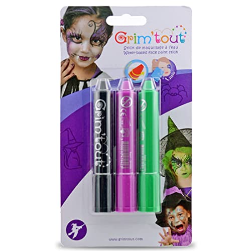 GRIM'TOUT Kit Maquillage Enfant - Noir, Vert, Violet - 3 Grimsticks Spécial Sorcière - Crayons de Couleurs, Maquillage à l’Eau - Faciles à Appliquer et Nettoyer - Makeup sur pour la Peau - Normes CE