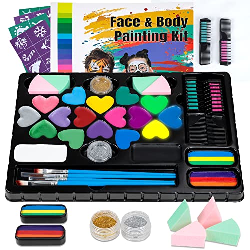 FLYISH DIRECT Maquillage Halloween, Maquillage enfant, 18 couleurs Maquillage halloween pour visage, avec 2 peintures arc-en-ciel, 2 paillettes, 4 pinceaux, et 4 éponges, 32 pochoirs réutilisables