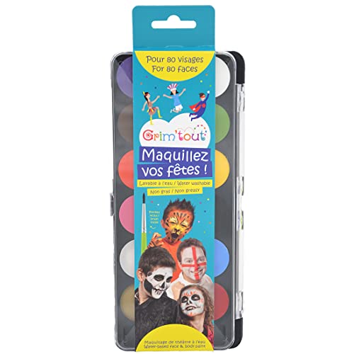 GRIM'TOUT Palette Maquillage Enfant Kermesse - 12 Couleurs - Application Facile Pinceau et Éponge - Eau Facile à Appliquer et Nettoyer - Peinture Visage Fille, Garçon - Activité Artistique