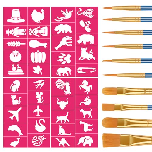 Alaoo 4 Pièces Pochoir Maquillage Enfant, Pochoirs de Peinture Faciale Réutilisables Tatouage de Peinture,Contient 10 PCS pinceaux de Peinture en Nylon pour Visage et Corps Halloween Fête,Rose Rouge