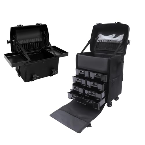 Mallette de maquillage à roulettes avec tiroir 2 en 1 - Mallette de maquillage professionnelle - Mallette de voyage amovible - Pour salon de beauté, studio de maquillage - Noir