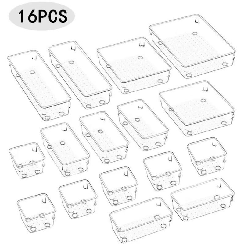 Organisateur Maquillage Lot de 16, Plateaux de Rangement Plastique Boîte Stockage, Organiseurs de Tiroir pour Cosmétiques, Bureau, Cuisine