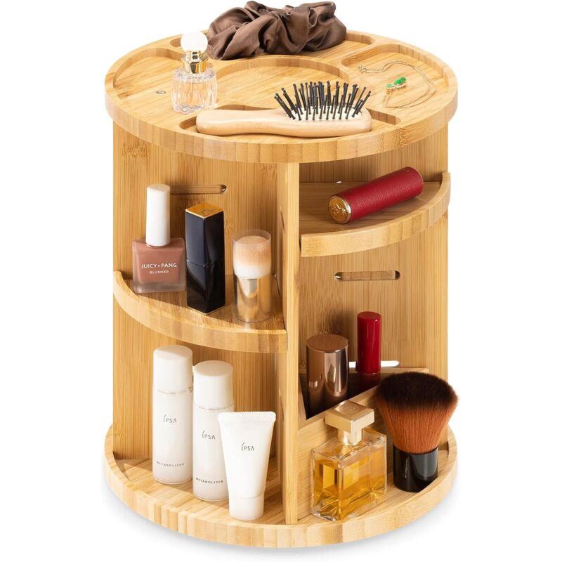 Organisateur maquillage rotatif en bambou, séparateurs réglables, pour salle de bain, skincare et produits beauté.