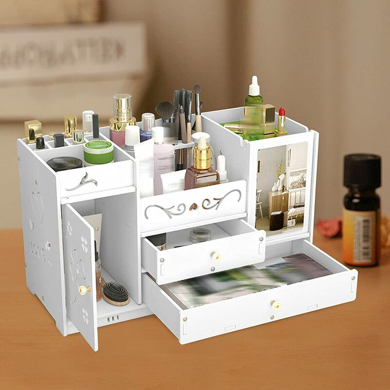 Rangement Maquillage, Organisateur de Cosmétiques avec 2 Tiroirs, Boîte à Bijoux et Support Cosmétique Rangements pour Salle de Bain et Chambre