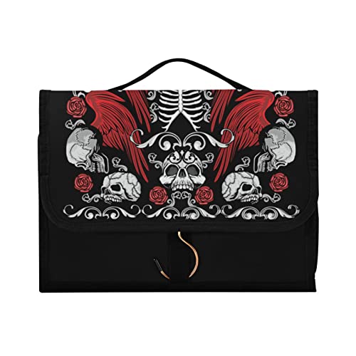 1 trousse de toilette à suspendre avec crochet - Style vintage gothique - Armoiries rouges - Ailes de rose - Tête de mort - Trousse de toilette portable pour pinceaux de maquillage