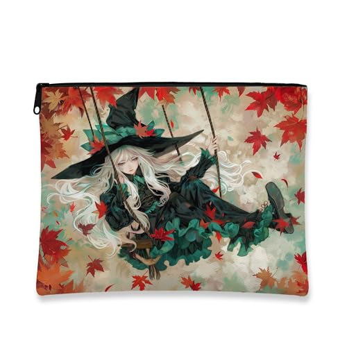 Trousse de maquillage fantaisie, motif sorcière, feuilles d'automne portable, petite pochette en toile à fermeture éclair pour femme, idéal pour les voyages, cadeau d'automne, vert, 7x9 Inch, Sac