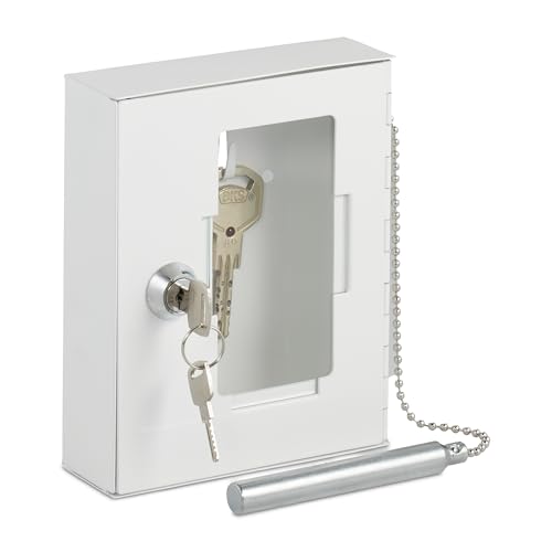 Relaxdays Boîte à clés d'urgence, avec vitre de Verre, Marteau Brise-Glace et 2 clés, verrouillable, métal, Blanche