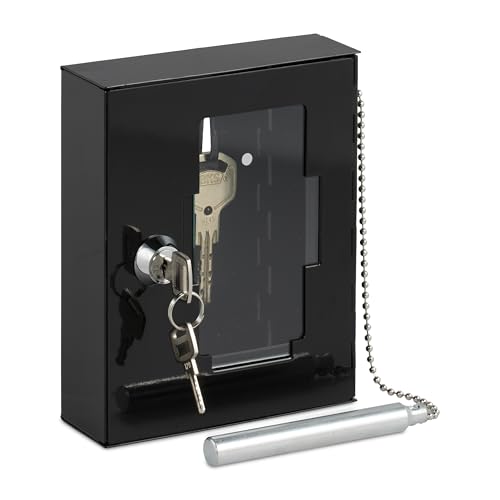 Relaxdays Boîte à clés d'urgence, avec vitre de Verre, Marteau Brise-Glace et 2 clés, verrouillable, métal, Noire, Noir