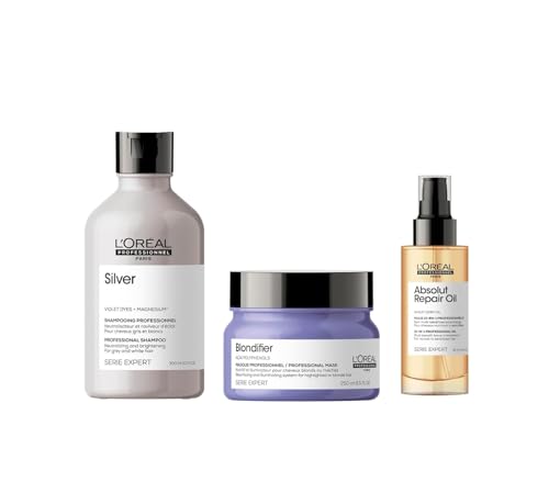 L'Oréal Professionnel|Shampoing Neutralisant Raviveur d'Éclat+Masque Nutritif+Huile de Finition 10-en-1 pour Cheveux Gris ou Blancs, Silver+Blondifier+Absolut Repair, SERIE EXPERT,300 ml+250ml+90ml