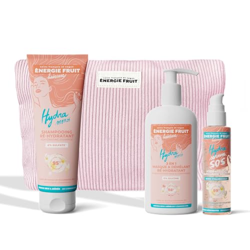 ENERGIE FRUIT - Coffret cadeaux routine capillaire cheveux secs abîmés - Monoi et acide hyaluronique - Trio shampooing réhydratant, masque hydratant, sérum protecteur - Trousse offerte