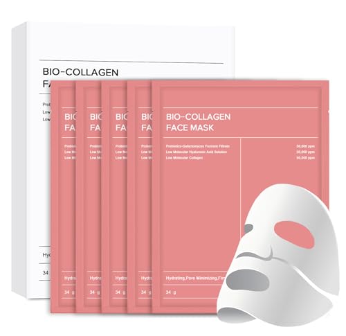 Masque Collagene Visage, Bio Collagen Face Mask 5 Pièces, Hydratant Anti-âge, Resserre les Pores, Améliore L'élasticité de la Peau, Masque Collagène pour Tous Types de Peau