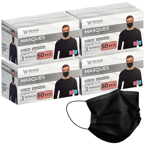 Masque chirurgical certifié noir pour adultes, lot de 10 à 600 pièces