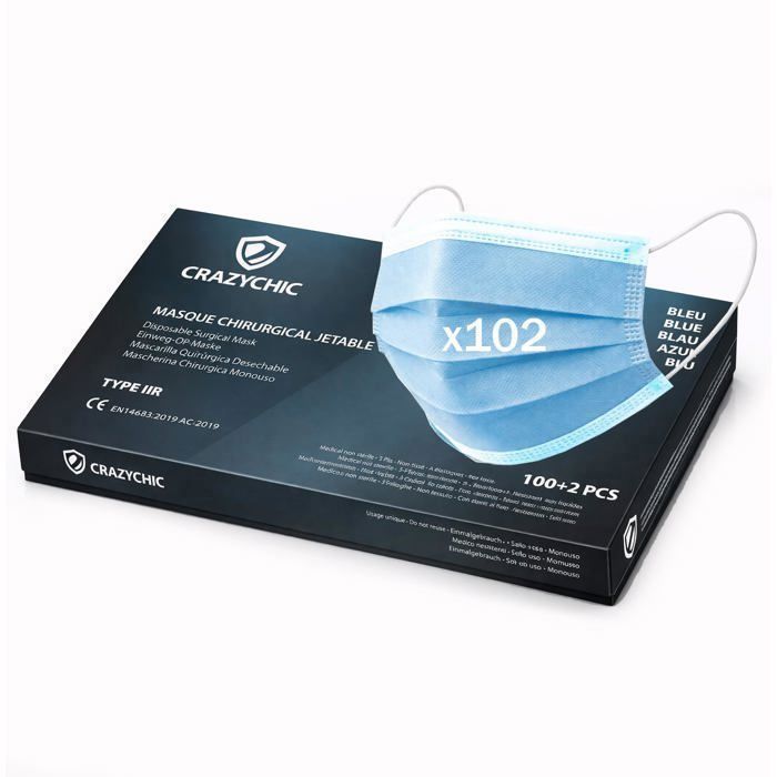 CRAZYCHIC - x102 Masque Chirurgical Médical Bleu Type IIR - Certifié CE Norme EN14683 Masque 3 Plis Protection Respiratoire EFB>99%