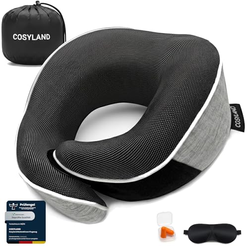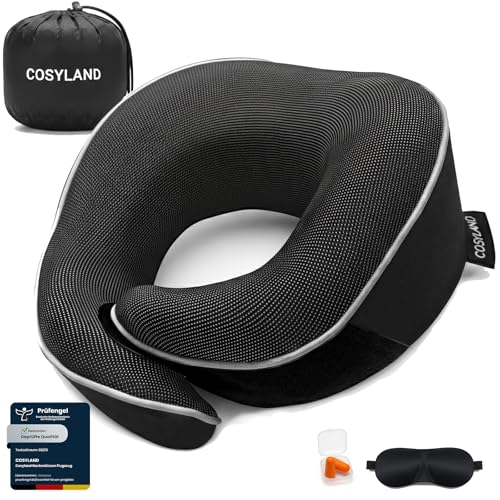 COSYLAND Coussin de Voyage Avion - Oreiller de Voyage Ergonomique avec Support 360° en Mousse à Mémoire de Forme - Tour de Cou Avion, INCL. Masque de Sommeil & Bouchons d'oreilles - Lavable - Noir