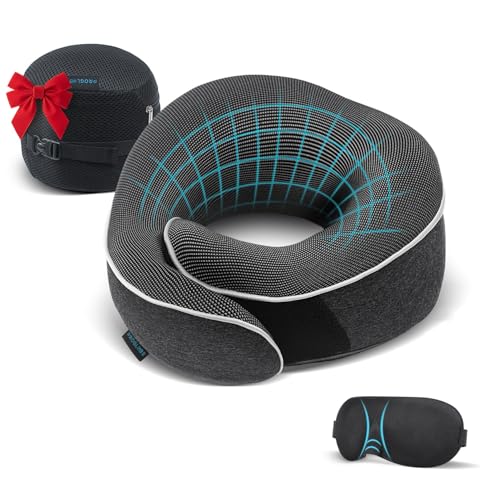 Proglobe Coussin de Nuque, Coussin de Voyage, 100% Mousse à mémoire de Forme, Coussin orthopédique, pour Voyage en Avion, Voiture, Train, avec Masque de Sommeil 3D, Sac en Maille, Gris Foncé
