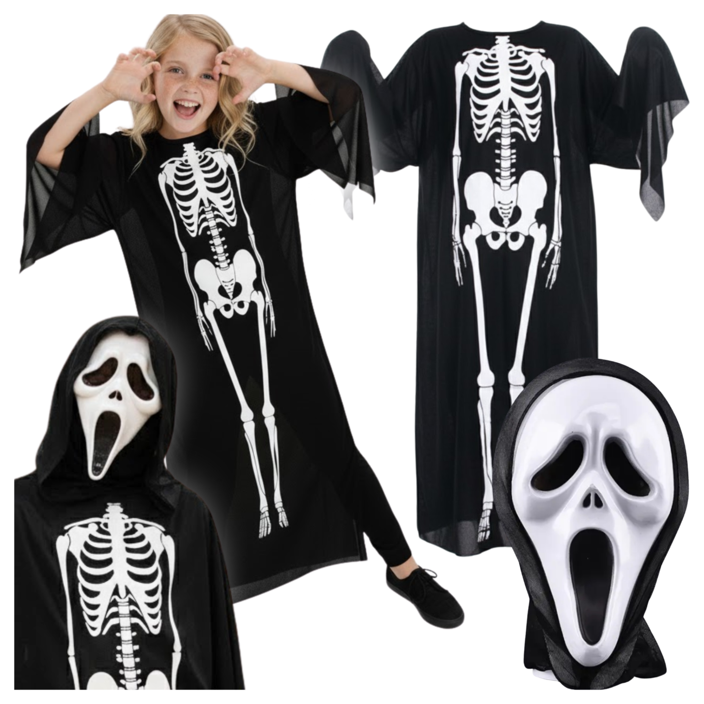 amscan Costume de faucheuse pour enfant, combinaison, cape, masque, grim reaper, squelette, horreur, fête à thème, carnaval, Halloween