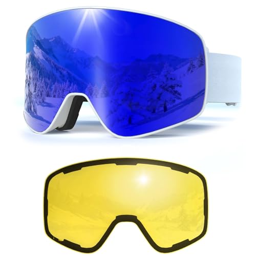 Masque de Ski avec Magnétique Lentille Interchangeable,YH212 Lunettes de Ski OTG pour Unisexes Ajustables Anti Buée Coupe-Vent Anti-UV Lunettes de Snowboard pour Sports Hiver (05-REVO Blue/White)
