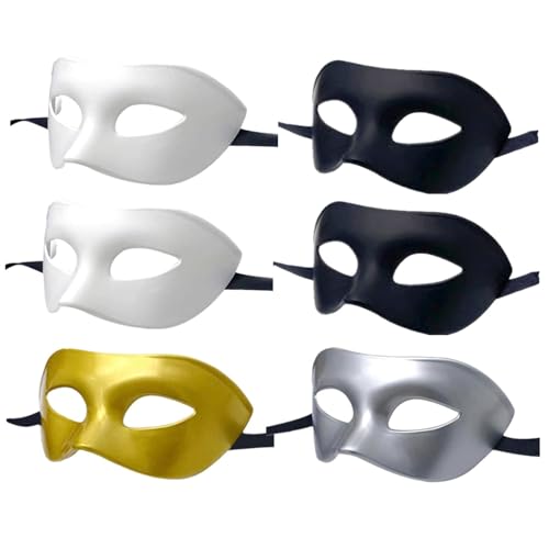 LECMACY Masque de bal masqué pour homme et femme, demi-masque en plastique souple et élastique, couleur unie, convient à tous les bals de fin d'année (2 noirs + 2 blancs + or + argent)