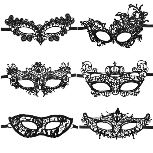 Zosutetoxo Masque Masqué Masque Vénitien, Lot de 6 Masques Élégants en Dentelle Noire pour Femme pour Soirée Gothique