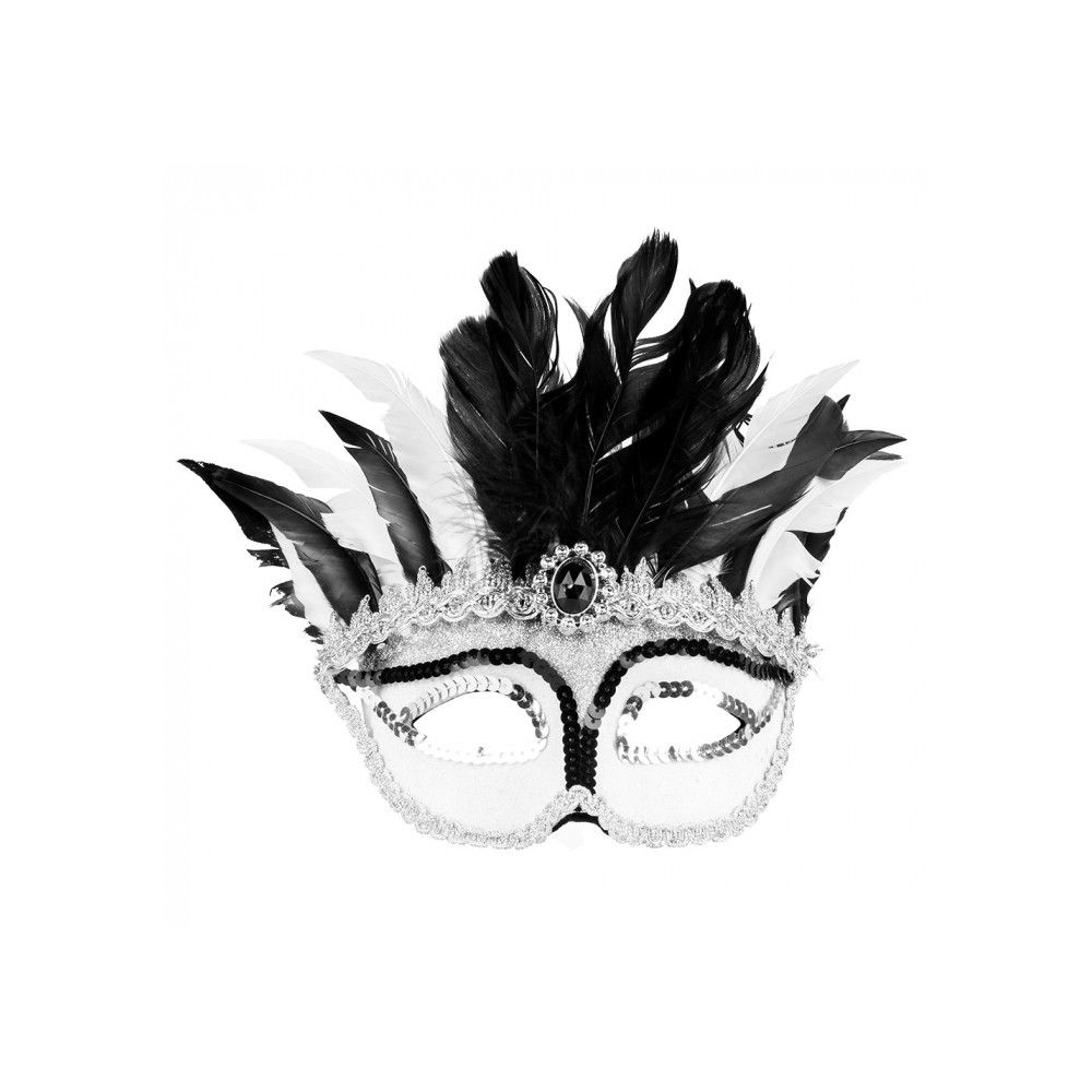 Loup Vénitien à Plumes - BOLAND - Demi-masque blanc à sequins et plumes blanches et noires - Femme Adulte