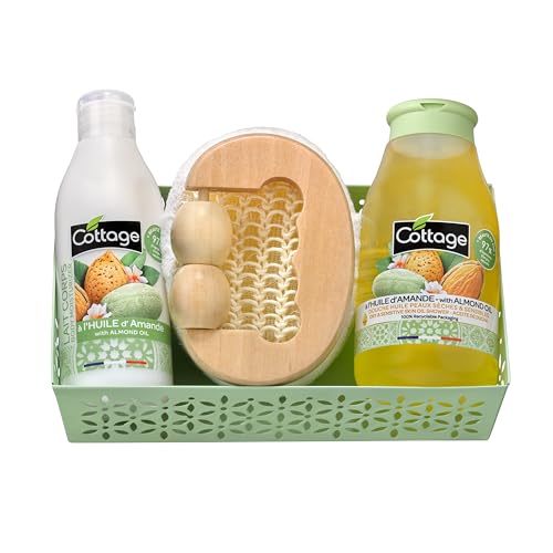 Cottage Coffret Cadeau Huile d'Amande - 1 Gel douche Huile + 1 Lait Corps Hydratant + 1 éponge exfoliante + 1 masseur bois - Fabriqué en France - 97% d'ingrédients d'origine naturelle