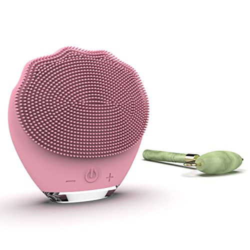 WottoCare Nettoyant Facial et Masseur en Silicone Rechargeable avec Rouleau de Jade Naturel et Pochette de Transport - Nettoyage Intelligent pour Tous Types de Peaux - Masseur Anti-Âge - Rose