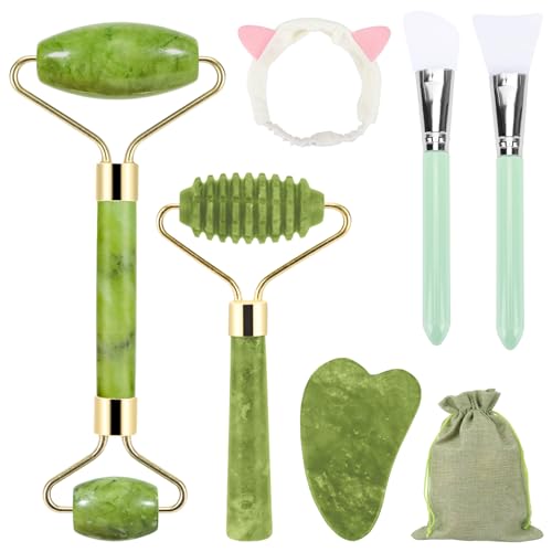 Coicok Rouleau de Jade et Gua Sha - Jade Roller Visage et Gua Sha Masseur - Rouleau de Jade Double Extrémité et Pierre de Massage Naturelle avec Sac de Rangement pour Anti-âge Anti-rides