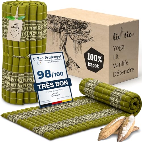 livasia tapis enroulable matelas enroulable large confortable L - 200x110x4,5cm - Lit matelas d’invité 1 personne, Lit de voyage coffre, Matelas thaï kapok jardin balcon fait main (Marron/Vert)