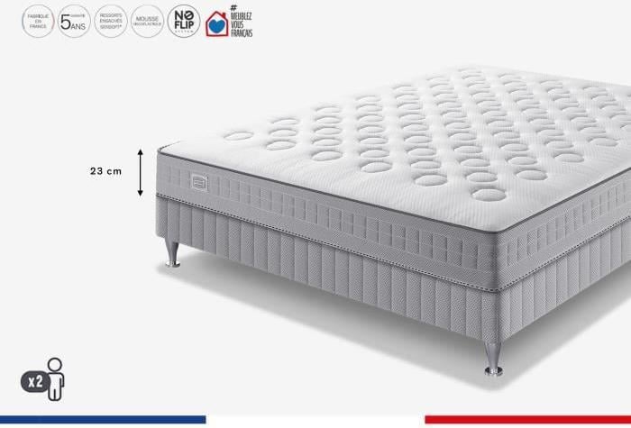 Matelas Simmons, 140 x 190 cm, Ressorts ensachés Sensoft, Hauteur 23 cm, No Flip, Fabriqué en France