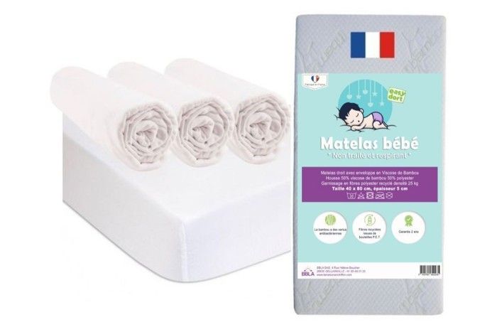 KIT PRATIQUE BEBE Matelas 40x80 Berceau Couffin Bambou + 3 Draps housse Bio + 2 Alèses Bio Certifié GOTS Fabrication France UE