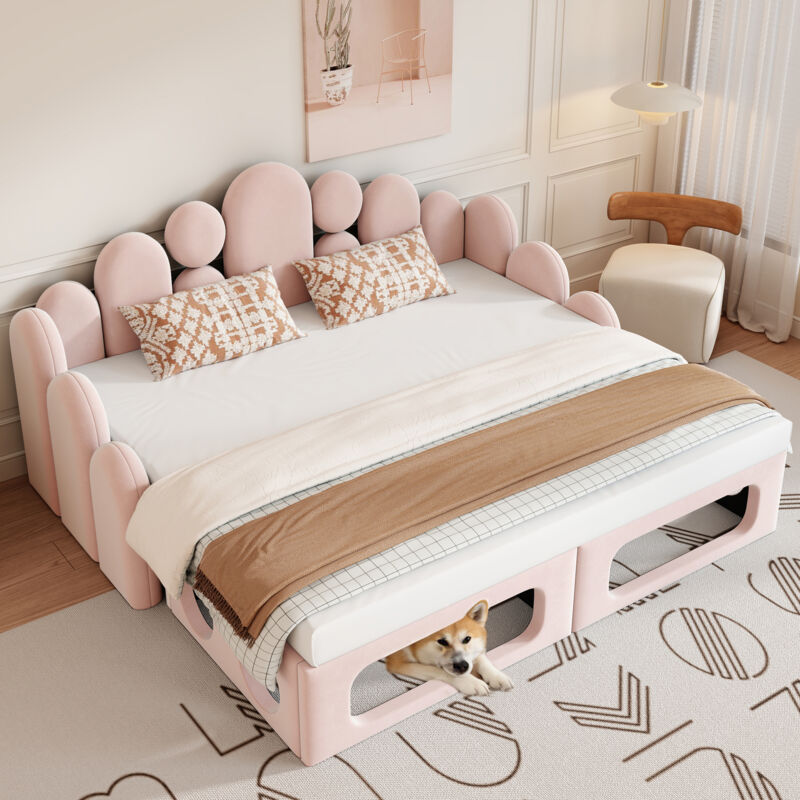 Lit gigogne 180x200 cm avec lit pour animal de compagnie, lattes de literie et dossier, en velours rose, sans matelas