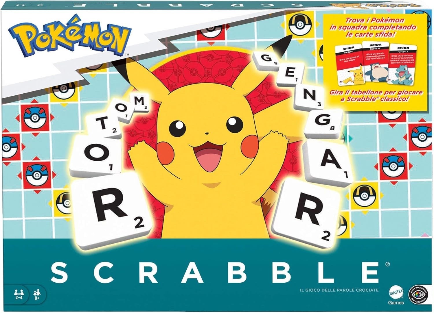 Mattel Games - Scrabble Pokémon, le jeu de société de mots croisés avec 50 défis des personnages Pokémon, tableau double face avec deux modes de jeu, version italienne, 8+ ans, HXT30