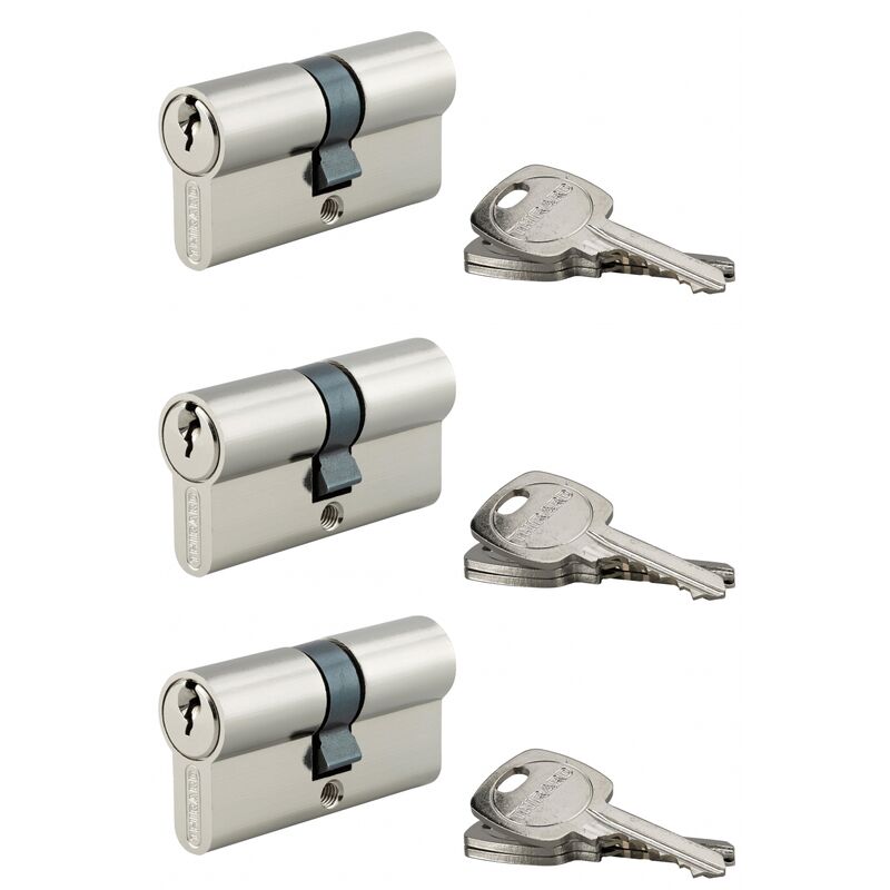 Thirard – Lot de 3 cylindres de serrure double entrée 30x30mm – 9 clés en laiton nickelé – Panneton anti-arrachement – Mécanisme à 5 goupilles
