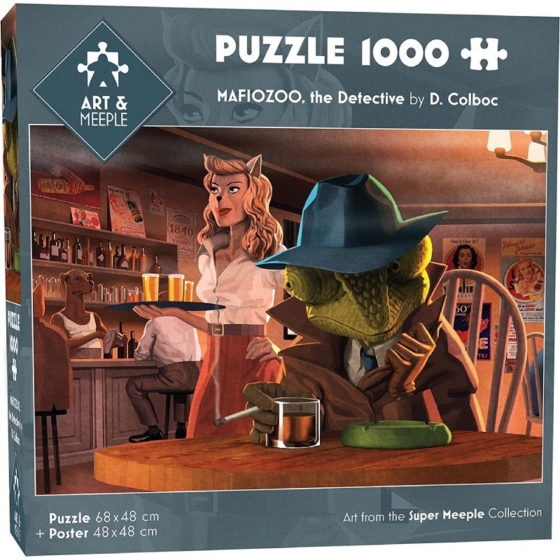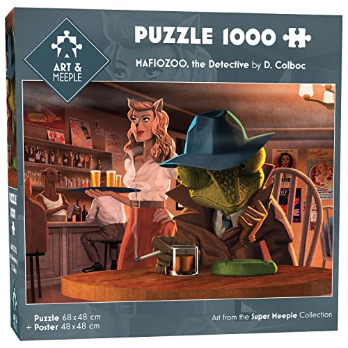 ART&Meeple Puzzles 1000 pcs 68x48 cm Haute Qualite + Poster 48x48 cm, Découpe Originale des pièces, Carton épais contrecollé des 2 côtés avec Papier Vernis – MAFIOZOO, The Detective