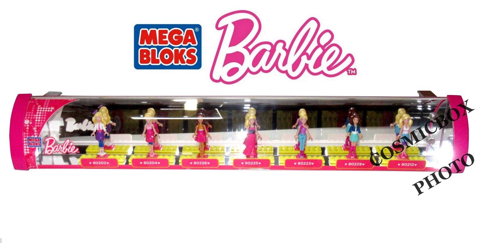 Très rare présentoir MEGA BLOKS série BARBIE 7 figurines sous vitrine plv figure