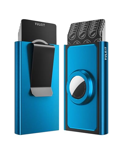 VULKIT Porte Carte Bancaire Automatique RFID Blocage avec Porte-Airtag et Pince à Billets, Porte-Cartes de Crédit en Aluminium Anti-Piratage pour Homme, Bleu