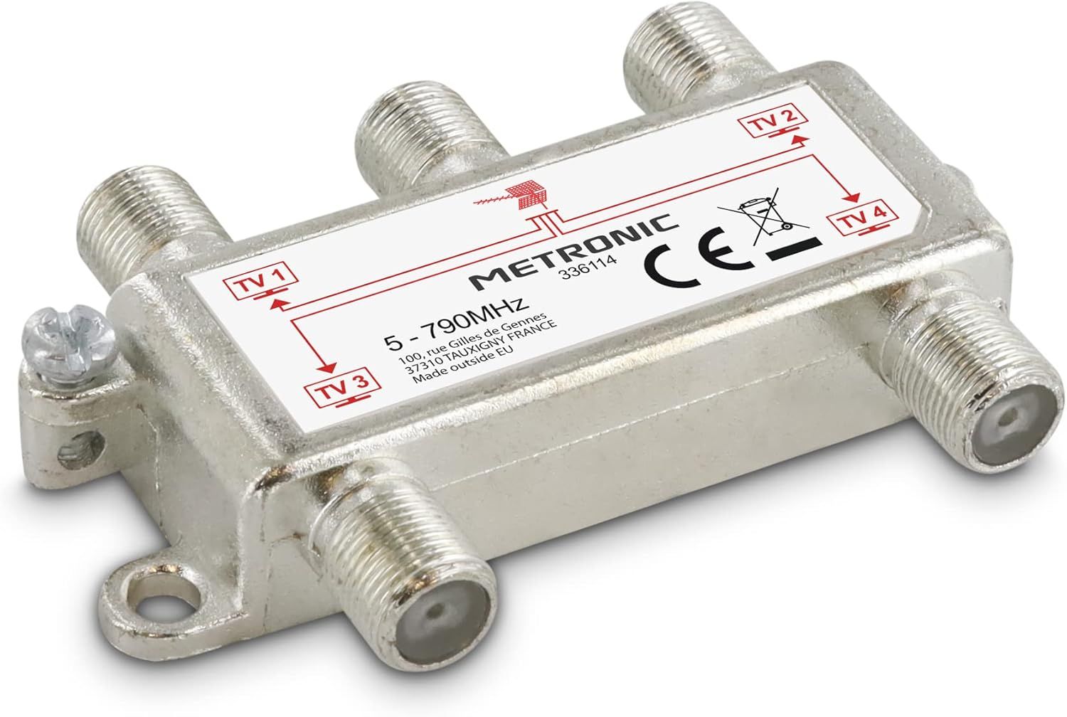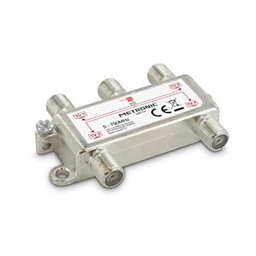 Metronic 336114 Répartiteur TV Antenne TNT 4 Sorties à fiche F Blindé Métal, Splitter Téléviseur pour 4 postes
