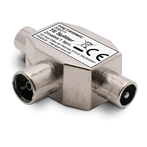 Metronic 336211 Répartiteur Antenne TV TNT 2 Voies - 1 Entrée Femelle pour l'Antenne / 2 Sorties Mâles Téléviseurs en Métal Blindé - Splitter