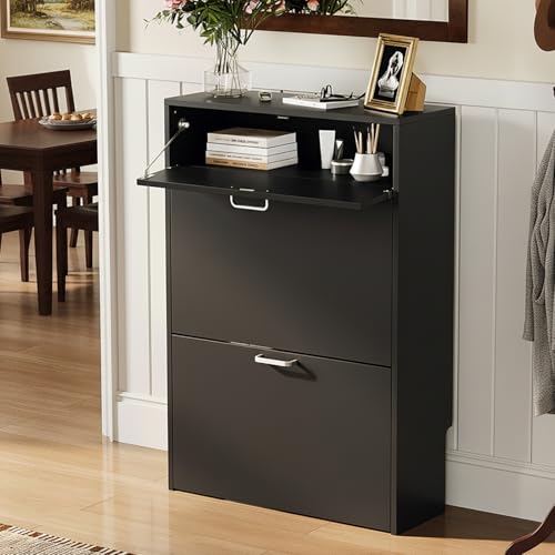 LEADZM Meuble à Chaussures 2 Portes 1 tiroirs Battantes Étroit, Étagère à Chaussures, Séparateur Réglable, pour Entrée, Salon, Chambre, 63,5 x 24 x 94 cm (Noir)