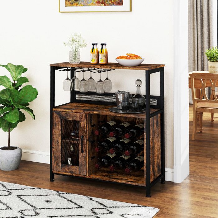 GIANTEX Meuble de Bar à Vin Buffet de Cuisine Casiers à 9 Bouteilles 3 Porte-Verres Étagère Amovibles 75x34x905cm Marron