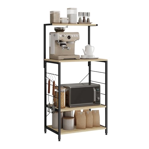WOLTU Étagère Micro Onde, Meuble Cuisine Rangement, à 4 Niveaux, 4 Crochets, 60x40x123cm, Chêne Clair + Blanc