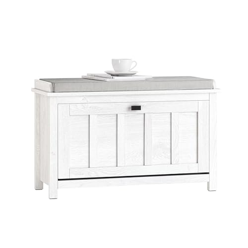 SoBuy Banc à Chaussures Rembourré – Meuble Chaussure Entrée avec Abattant Réglable et Coussin Confortable – Banc Rangement Chaussures pour Entrée – Blanc Vintage 80x30x50cm 150kg – FSR161-W