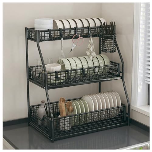 Grand Égouttoir À Vaisselle en Métal, Organisateur À Trois Niveaux pour Évier avec Porte Magnétique, Meuble De Séchage pour Évier De Cuisine Permettan(Noir Monocouche)