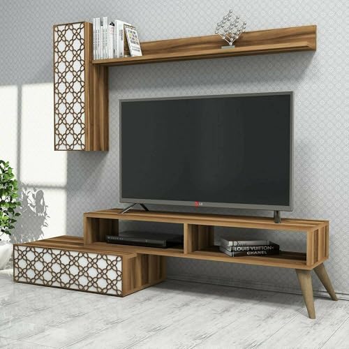 Dmora Mur équipé Sterope, Composition Salon, Meuble Salon Polyvalent, Armoire TV 150 x 37 x 38 cm, Noyer et Blanc